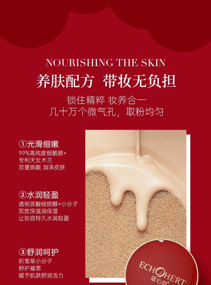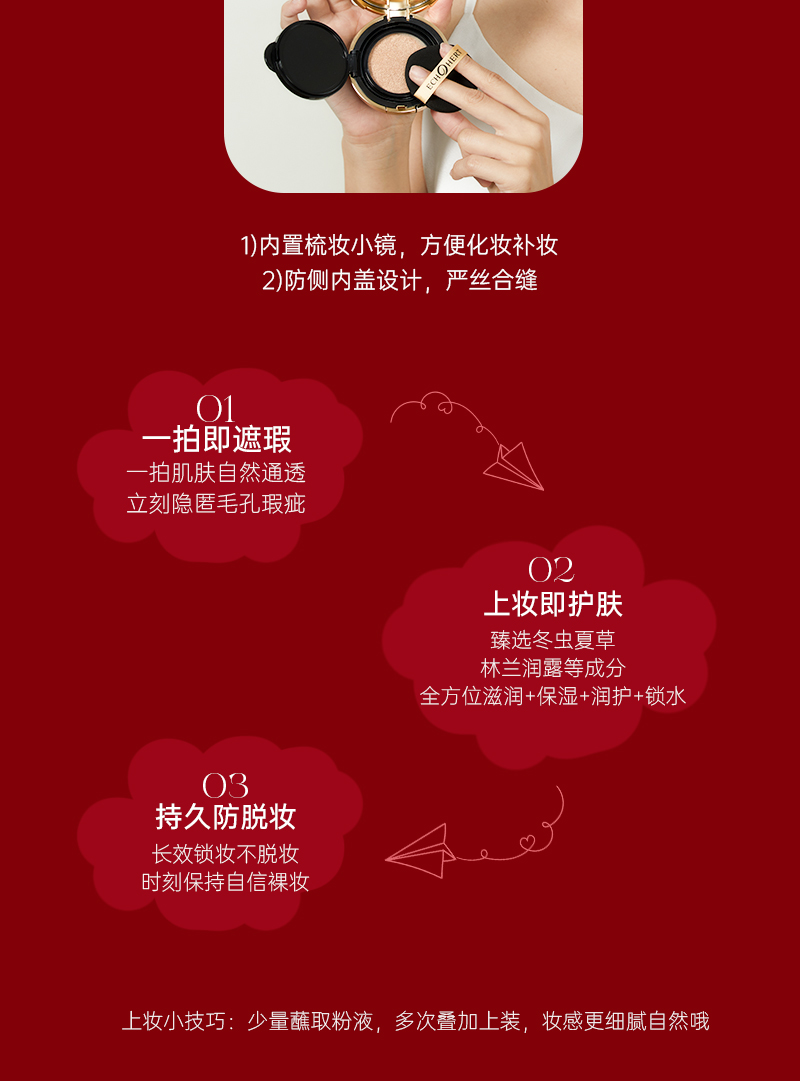 使用方法:基础护肤后,使用粉扑按压气垫取适量本品,以轻拍方式均匀涂抹于面部即可