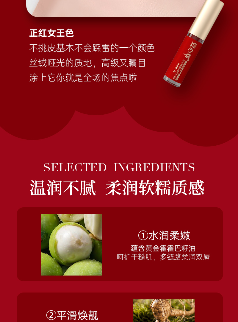 功效:丝绸般的质感,颜色馥郁 ,如雾色轻柔覆唇,娇唇宛若披上瑰丽华服;扁状刷头设计,精准勾勒唇部细节;打造气场全开的雾感唇妆