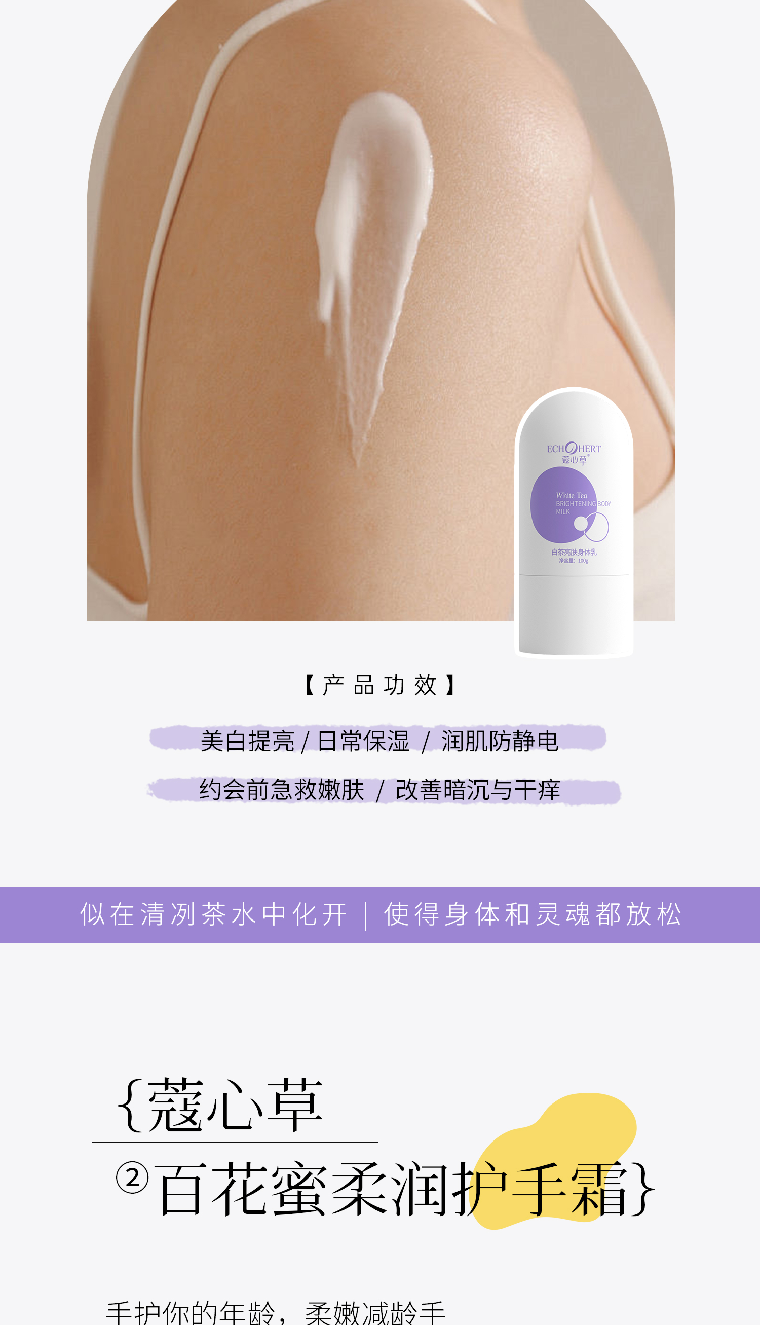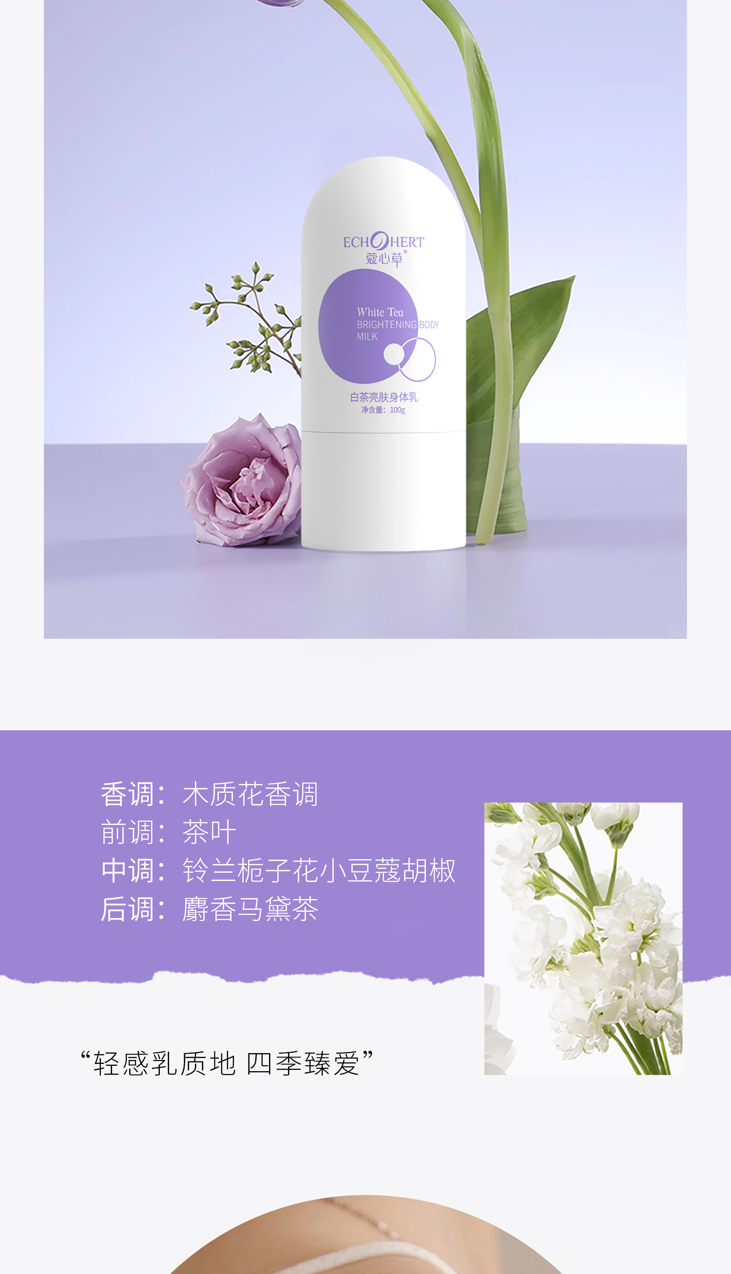功效:木质花香调,一抹沁香优雅而治愈。内添加烟酰胺成份,美白滋润,改善皮肤暗沉。长效保湿,告别干痒皮屑,清爽不油腻,约会前急救嫩肤好帮手!
