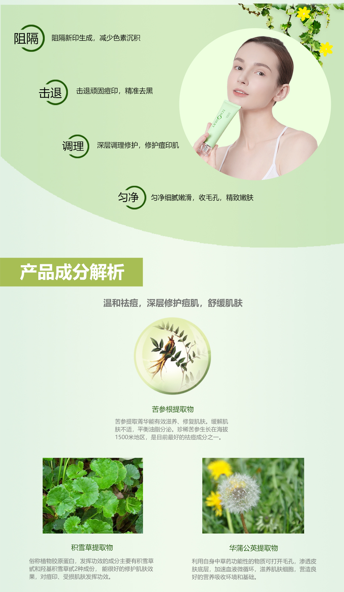 主要成分:甘油、苦参(SOPHORA ANGUSTIFOLIA)根提取物、直立百部(STEMONA SESSILIFOLIA)提取物、积雪草(CENTELLA ASIATICA)提取物、华蒲公英(TARAXACUMSINICUM)根提取物。