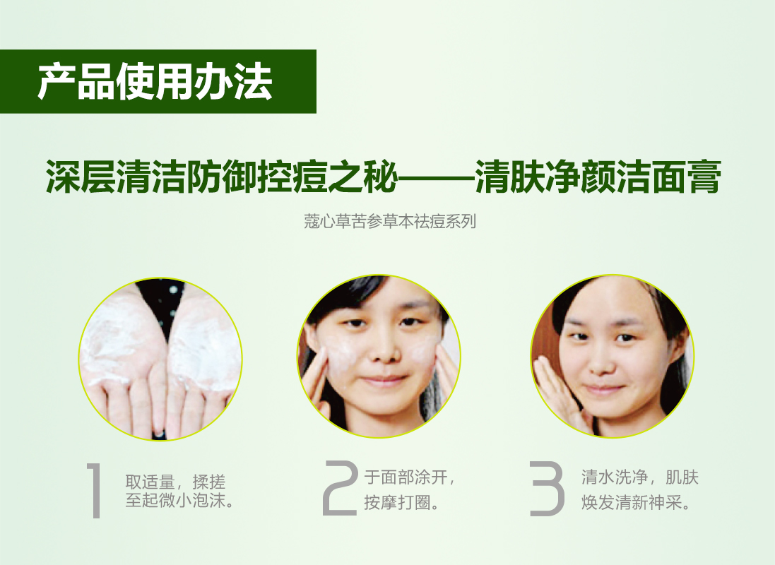 使用方法:取适量产品,揉搓至起小泡沫,于面部涂开,按摩打圈,清水洗净,肌肤焕发清新神采。