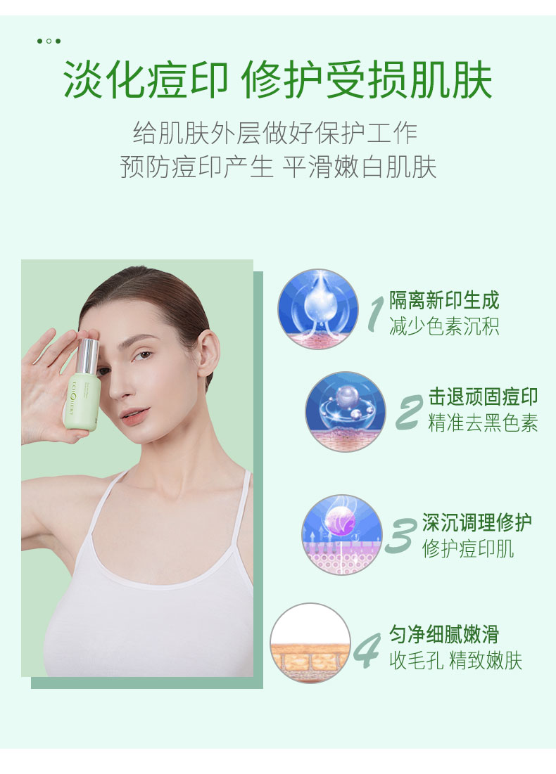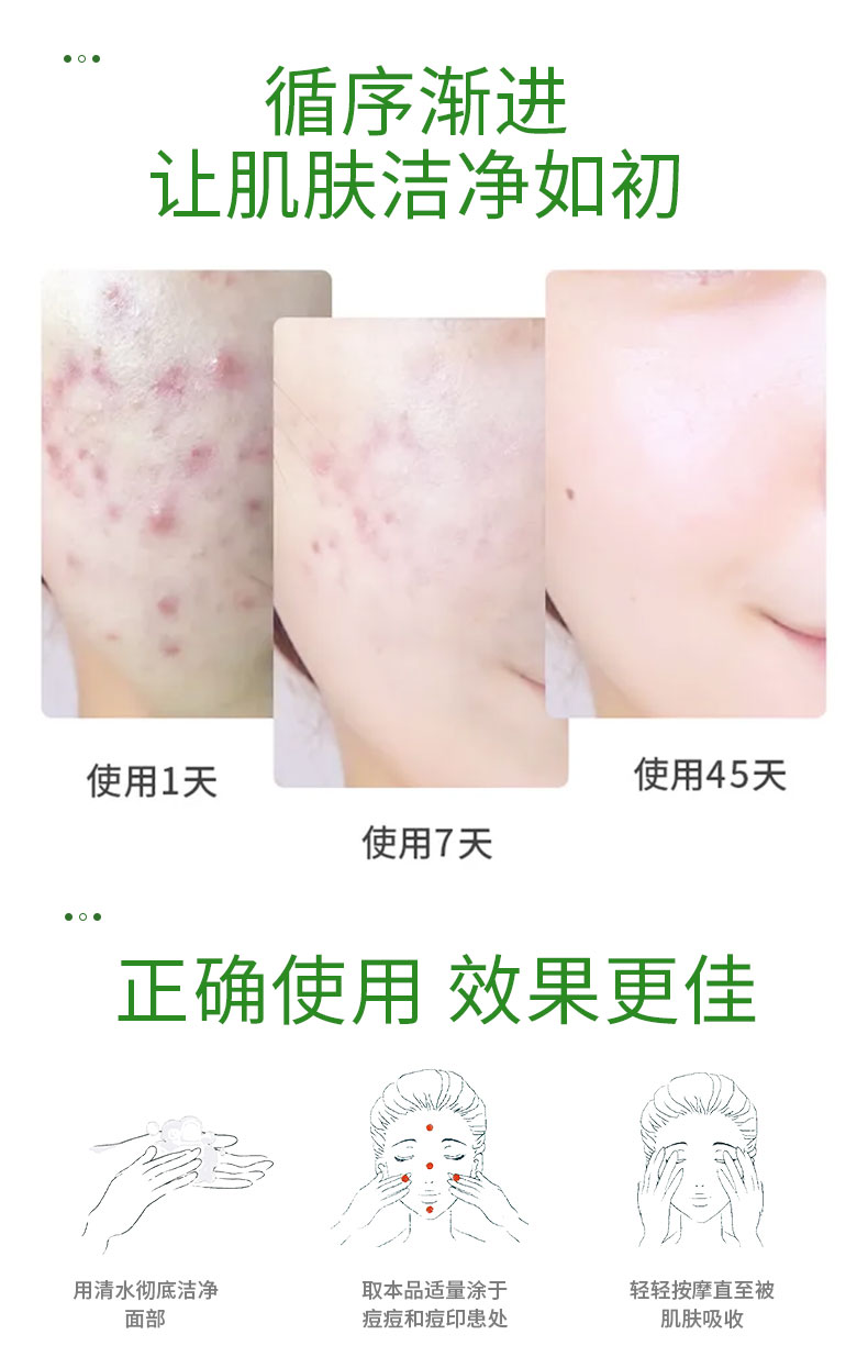 使用方法:洁净面部后,取本品适量涂于痘痘和痘印处,轻轻按摩直至被肌肤吸收。
