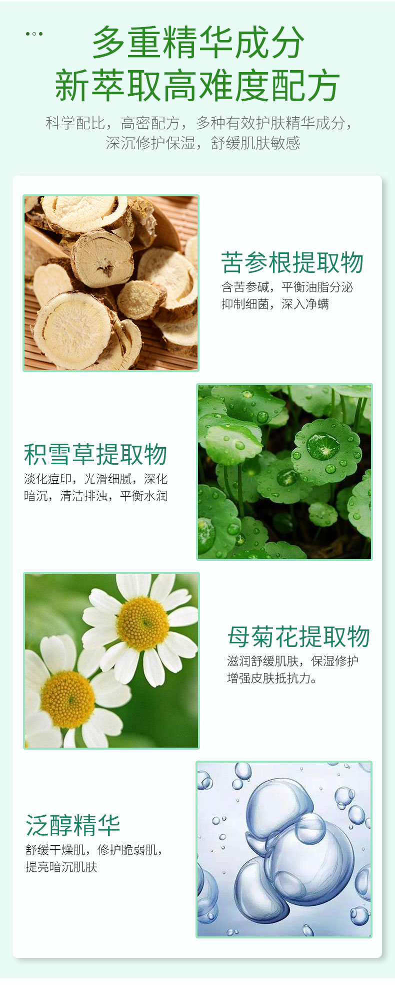 主要成分:水、丁二醇、鲸蜡醇、泛醇、积雪草/苦参根/直立百部/华蒲公英根/母菊花/茶叶光果甘草根/迷迭香叶/虎杖根/黄芩根提取物等