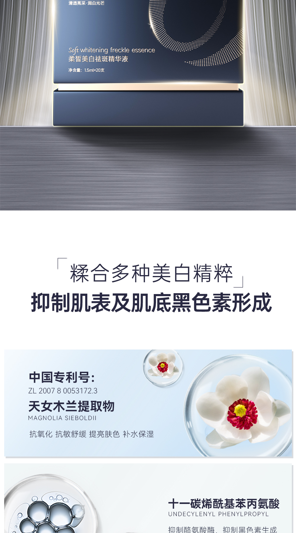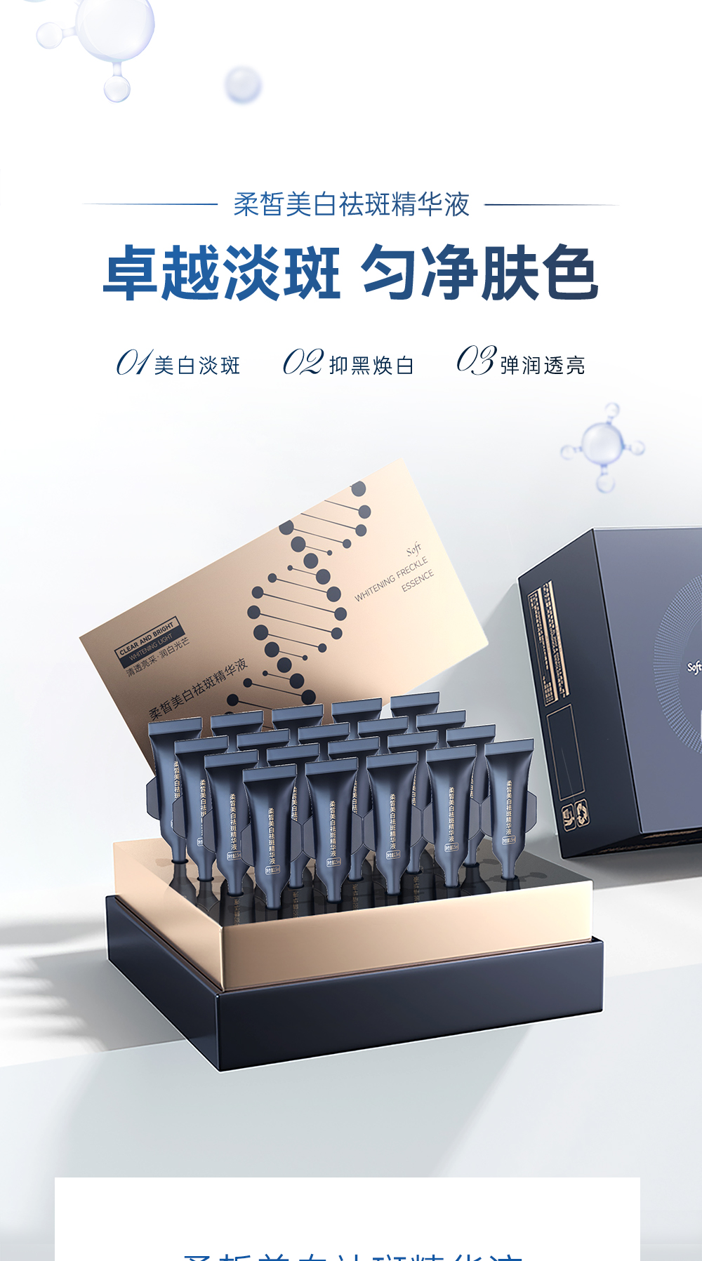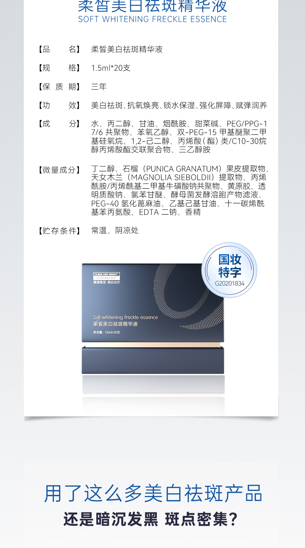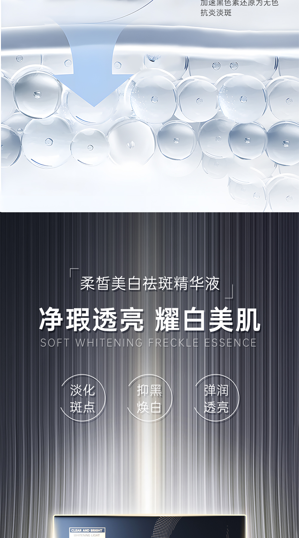 功效:多重活性美白成分,触肤沁融渗透,层层点亮“肌”底发挥美白作用,淡化色斑、亮泽肤质、紧塑淡纹、改善粗糙、稳固屏障,提升肌肤润白指数,看得见的水感透白,见证白里透光的转变,为你撑起光感白瓷丽人肌肤。