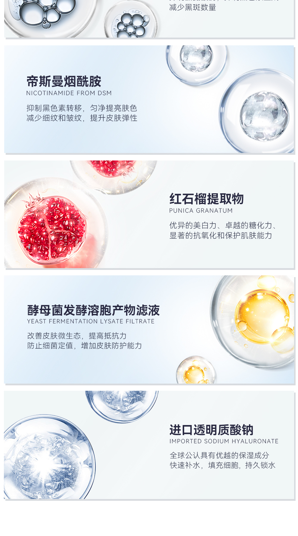 成分:水、甲基丙二醇、甘油、烟酰胺、甜菜碱、PEG/PPG-1716 共聚物、苯氧乙醇、双 -PEG-15 甲基醚聚二甲基硅氧烷、1,2-己二醇、丙烯酸(酯)类 /C10-30 烷醇丙烯酸酯交联聚合物、三乙醇胺、丁二醇、石榴(PUNICA GRANATUM)果皮提取物、天女木兰(MAGNOLIA SIEBOLDI)提取物、丙烯酰胺/丙烯酰基二甲基牛磺酸钠共聚物、黄原胶、透明质酸钠、氨苯甘醚、酵母菌发酵溶胞产物滤液、PEG-40 氢化蓖麻油、乙基己基甘油等。