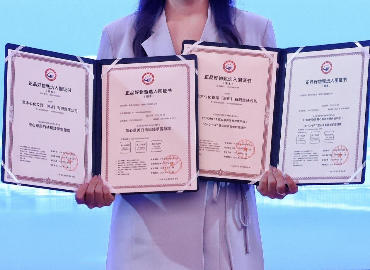 峰会现场,组委会表彰了一批坚守品质的优秀示范单位,授予荣誉证书。经各方评定,蔻心草旗下多效修护冻干粉和美白祛斑臻萃雪颜霜双双荣获“正品好物”证书,彰显了品牌在质量管控方面的不懈努力,蔻心草杨冉老师作为企业代表上台领取这一荣誉。