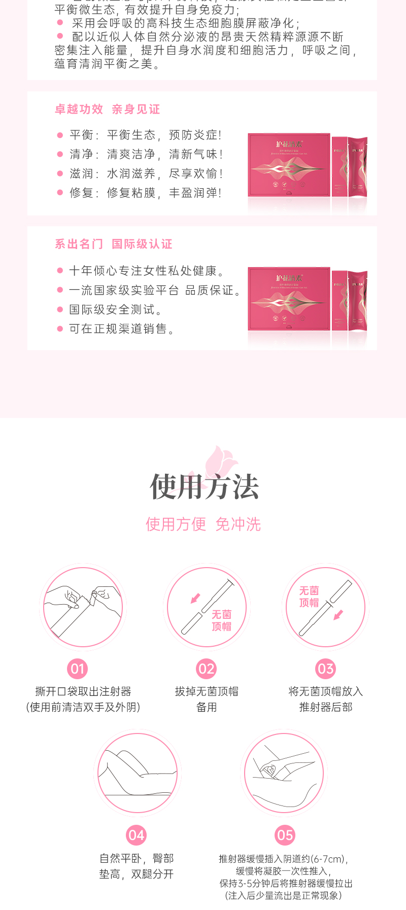 使用方法:取出注射器(使用前清洁双手及外阴)后,拔掉无菌顶帽备用,将无菌顶帽放入推射器后部,自然平卧,臀部垫高,双腿分开,推射器缓慢插入阴道约(6-175px),缓慢将凝胶次性推入,保持3-5分钟后将推射器缓慢拉出(注入后少量流出是正常现象)