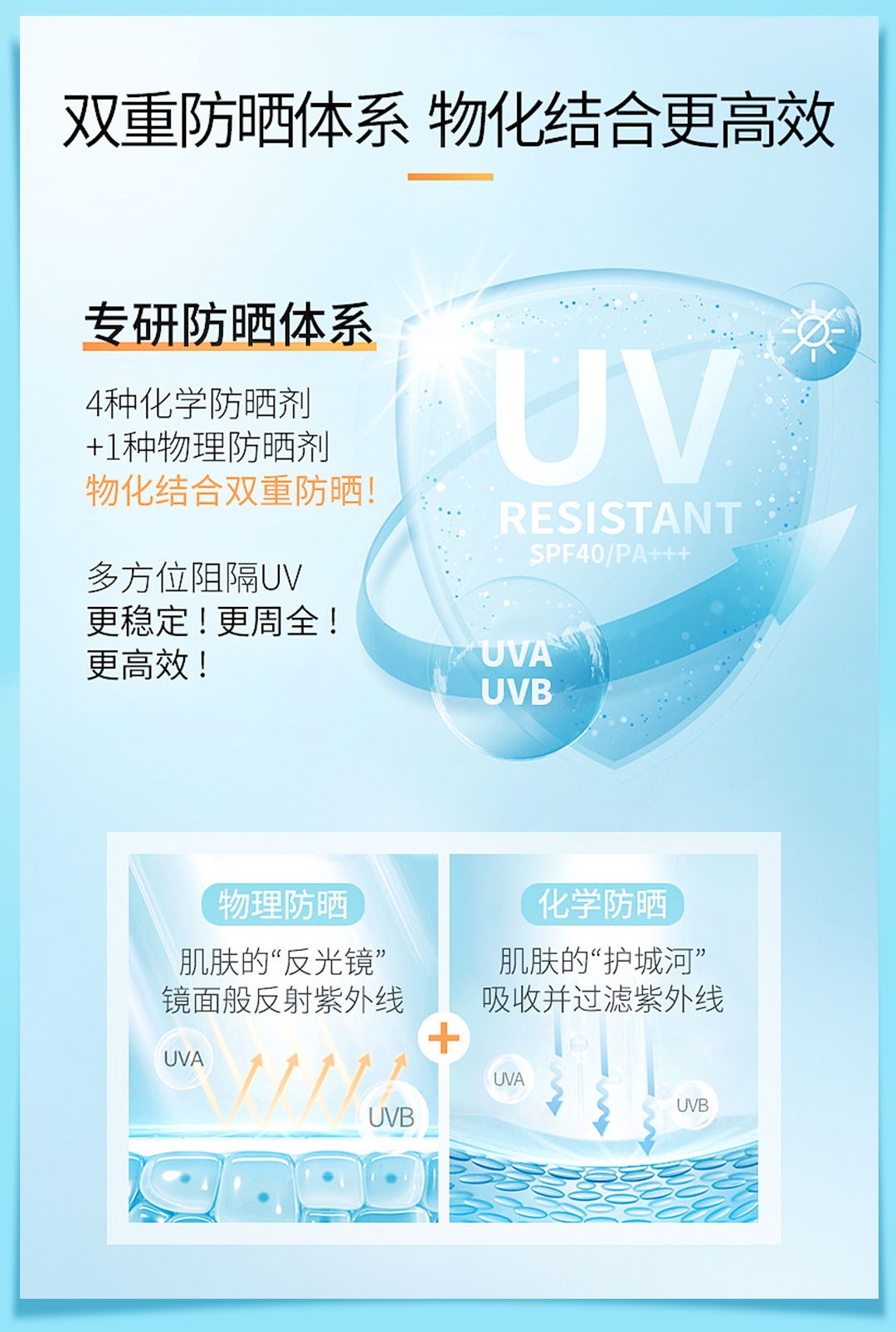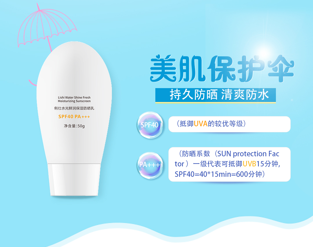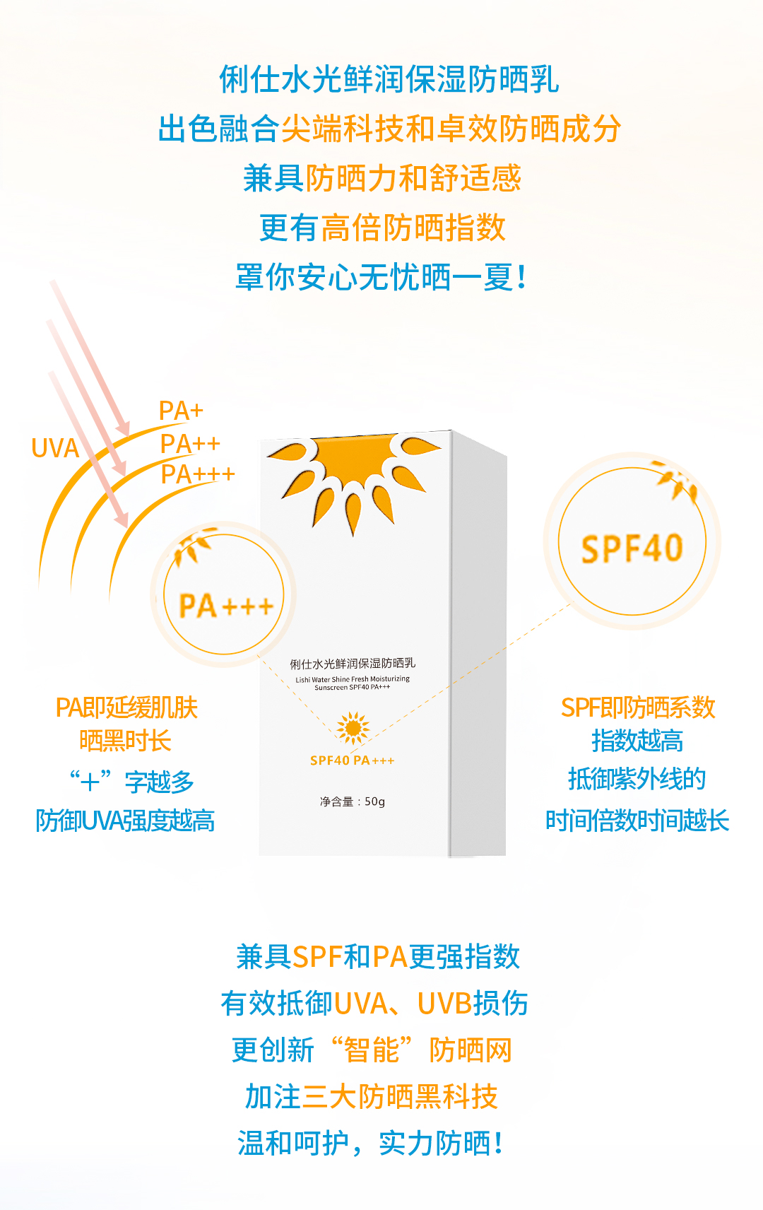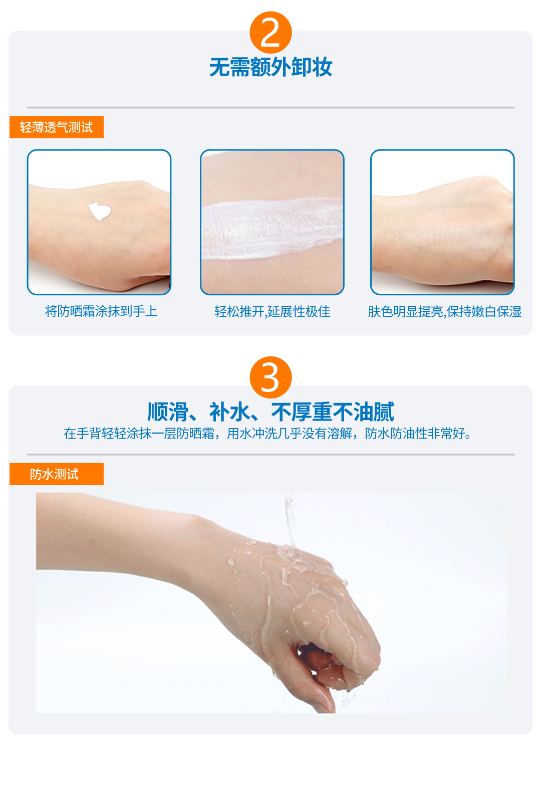 功效:质地轻盈、涂抹后易展开、高倍防护不黏腻,蕴含多种防晒成分及美白成分,有效防护UVA/UVB,同时也能提升肌肤的美白透亮度,做肌肤太阳下隐形的遮阳伞。
