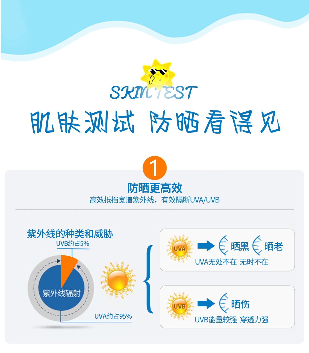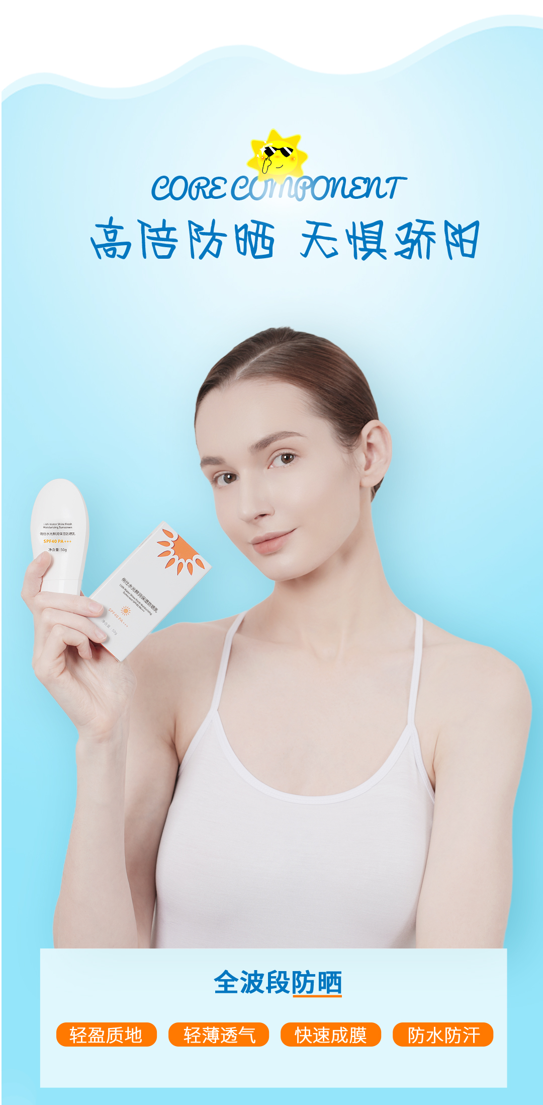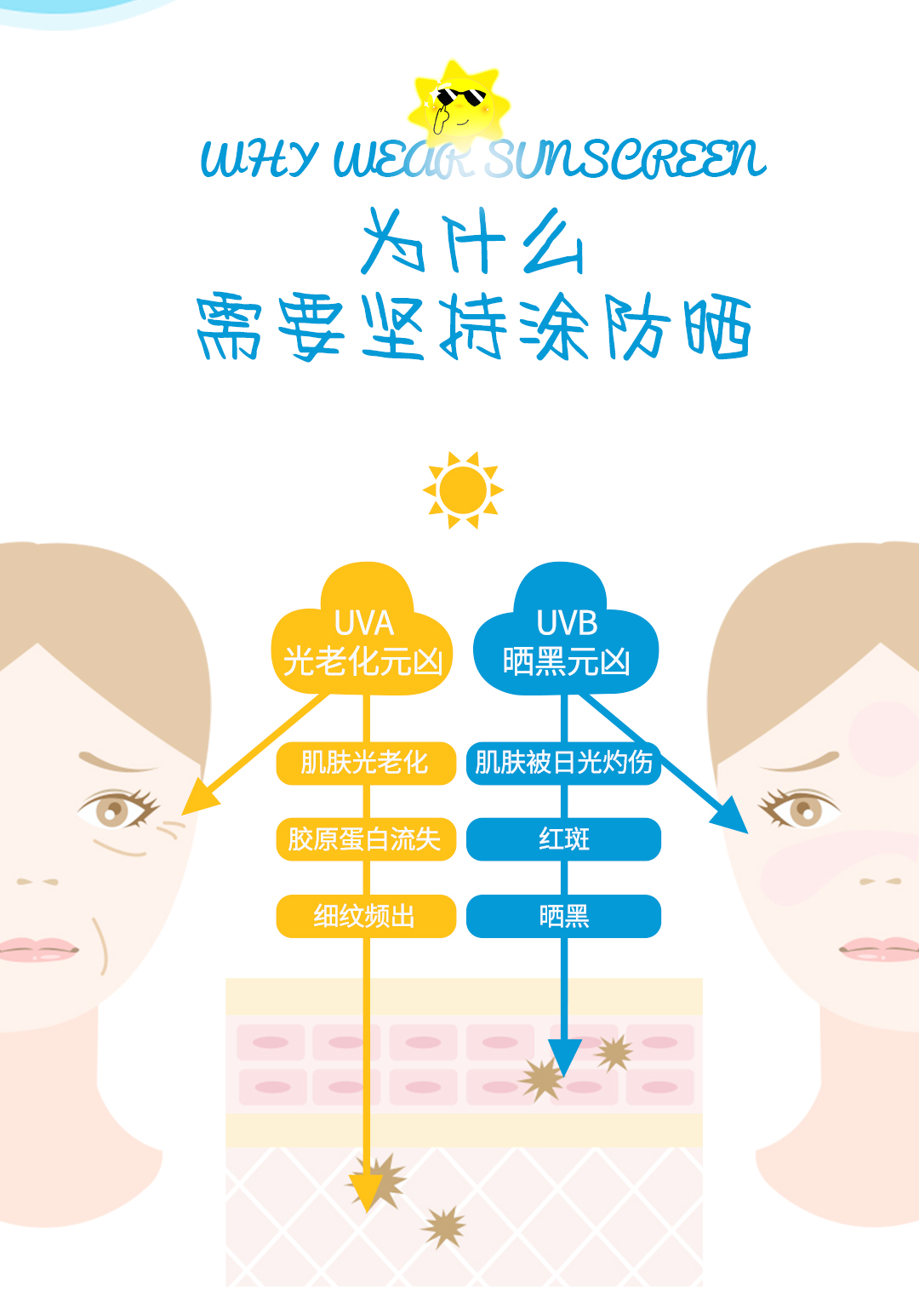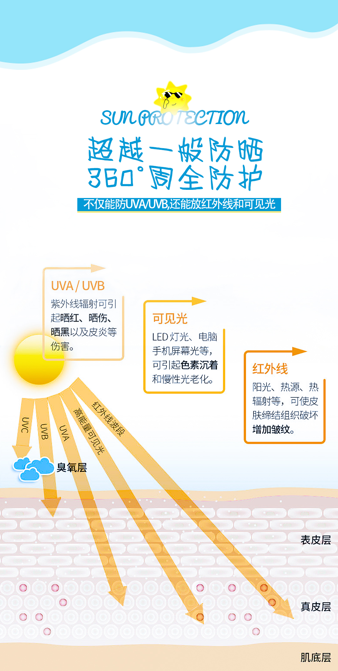 功效:质地轻盈、涂抹后易展开、高倍防护不黏腻,蕴含多种防晒成分及美白成分,有效防护UVA/UVB,同时也能提升肌肤的美白透亮度,做肌肤太阳下隐形的遮阳伞。