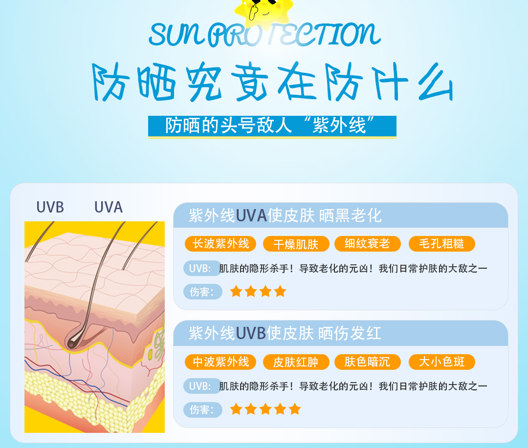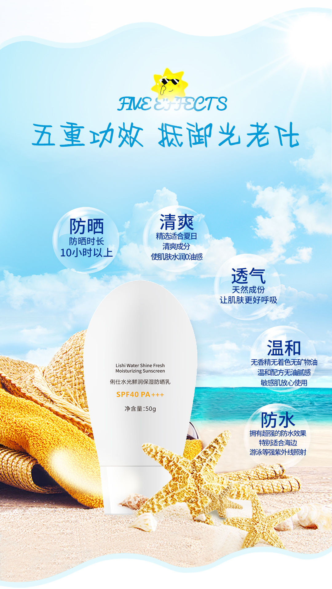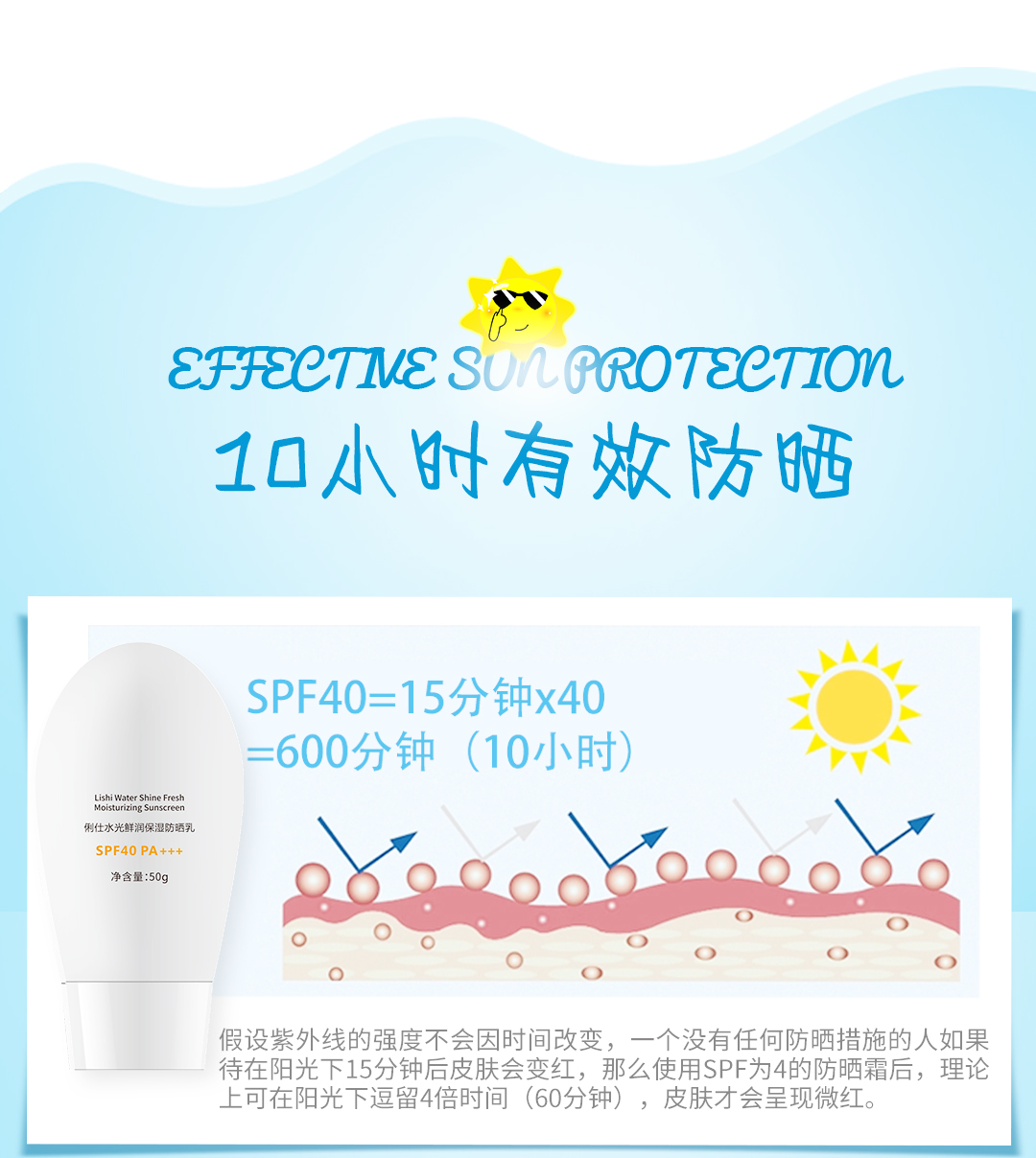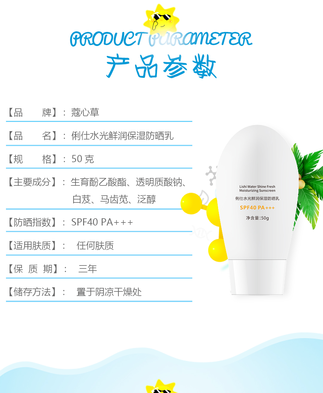 功效:质地轻盈、涂抹后易展开、高倍防护不黏腻,蕴含多种防晒成分及美白成分,有效防护UVA/UVB,同时也能提升肌肤的美白透亮度,做肌肤太阳下隐形的遮阳伞。
