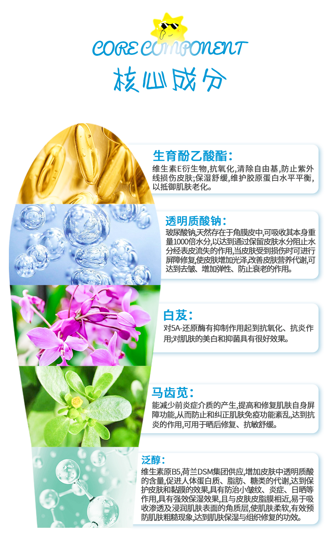 主要成分:生育酚乙酸酯、透明质酸钠、白芨、马齿苋、泛醇等