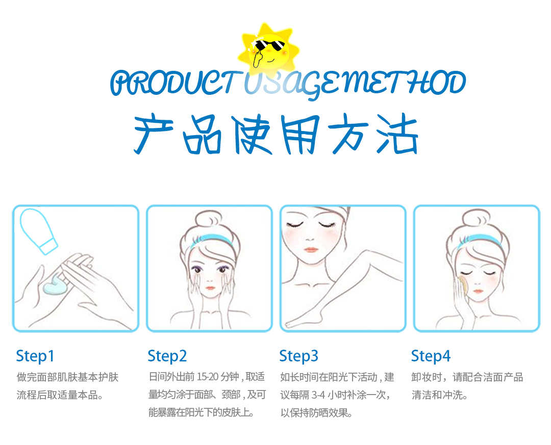 使用方法:日间外出前15-20分钟,取适量均匀涂于部、部,及可能暴露在阳光下的皮肤上,建议每时补涂一次,以保持防晒效果