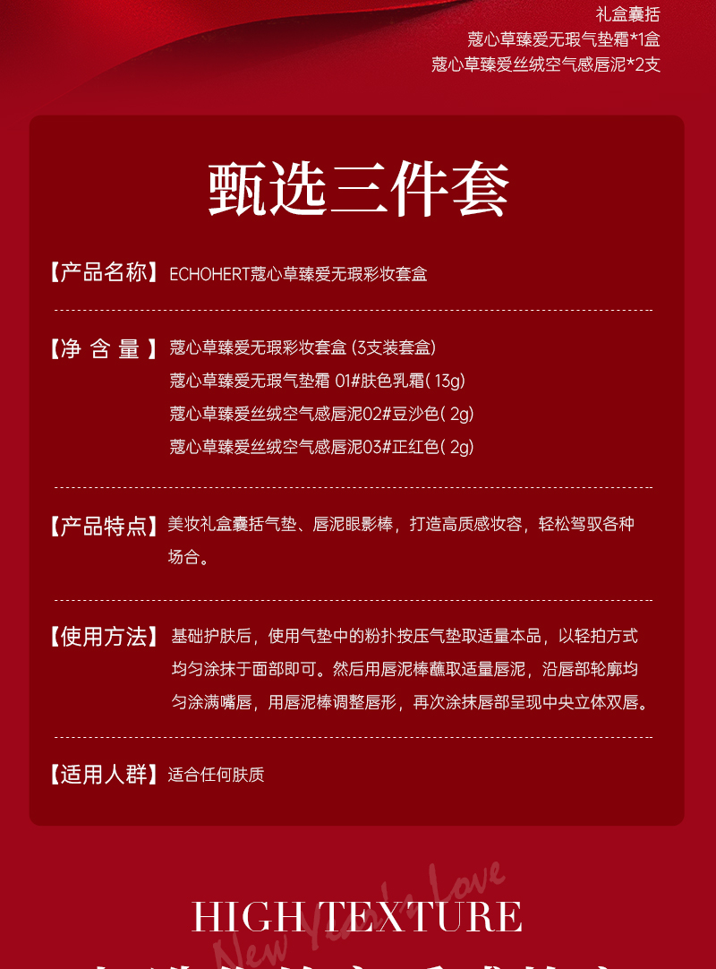 使用方法:基础护肤后,使用粉扑按压气垫取适量本品,以轻拍方式均匀涂抹于面部即可