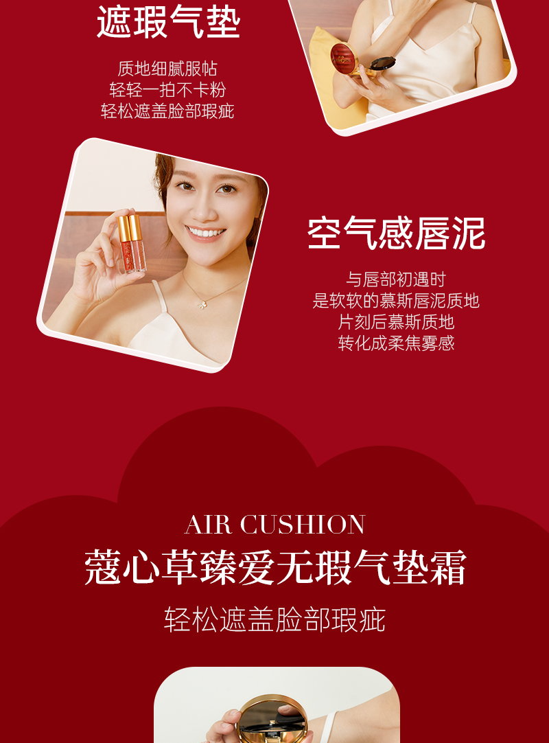 功效:空气气垫型粉霜,带来如丝绸般柔滑的涂抹感,令肌肤充满秀致光彩,带来修颜遮瑕的同时,缔造亮、润、贴妆效,告别卡粉浮粉,整个妆容显得匀净光采
