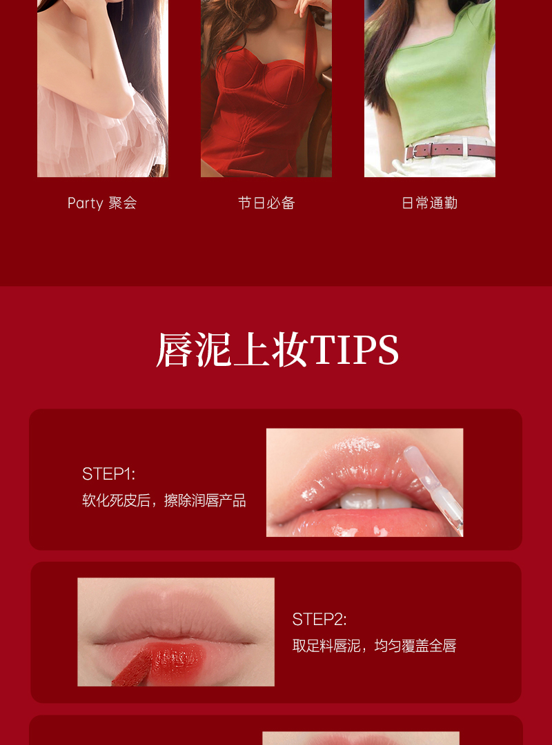 使用方法:用唇泥棒蘸取适量唇泥,沿唇部轮廓均匀涂满嘴唇,用唇泥棒调整唇形,再次涂抹唇部呈现中央立体双唇