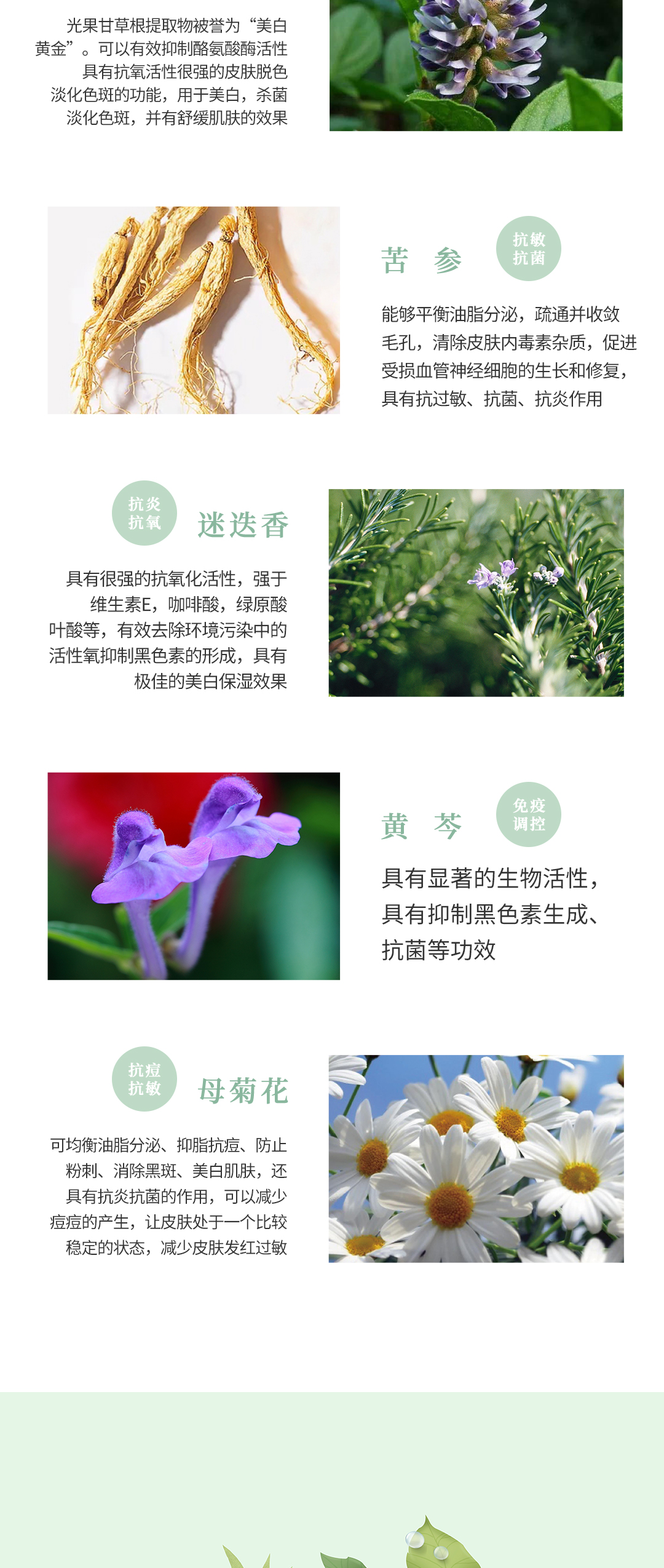 主要成分:苦参、积雪草、母菊花、迷迭香、虎仗根、黄芩根、光果甘草根等
