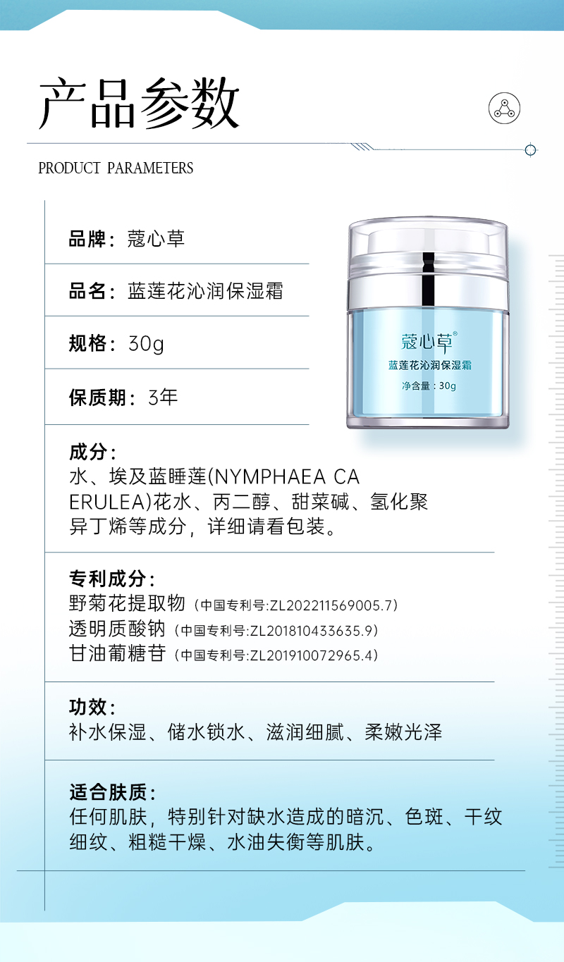 主要成分:埃及蓝睡莲花水、稀有珍贵油脂-莲花油、神农香菊香氛舒缓因子、神农仙草赋活因子等,详情请看包装。